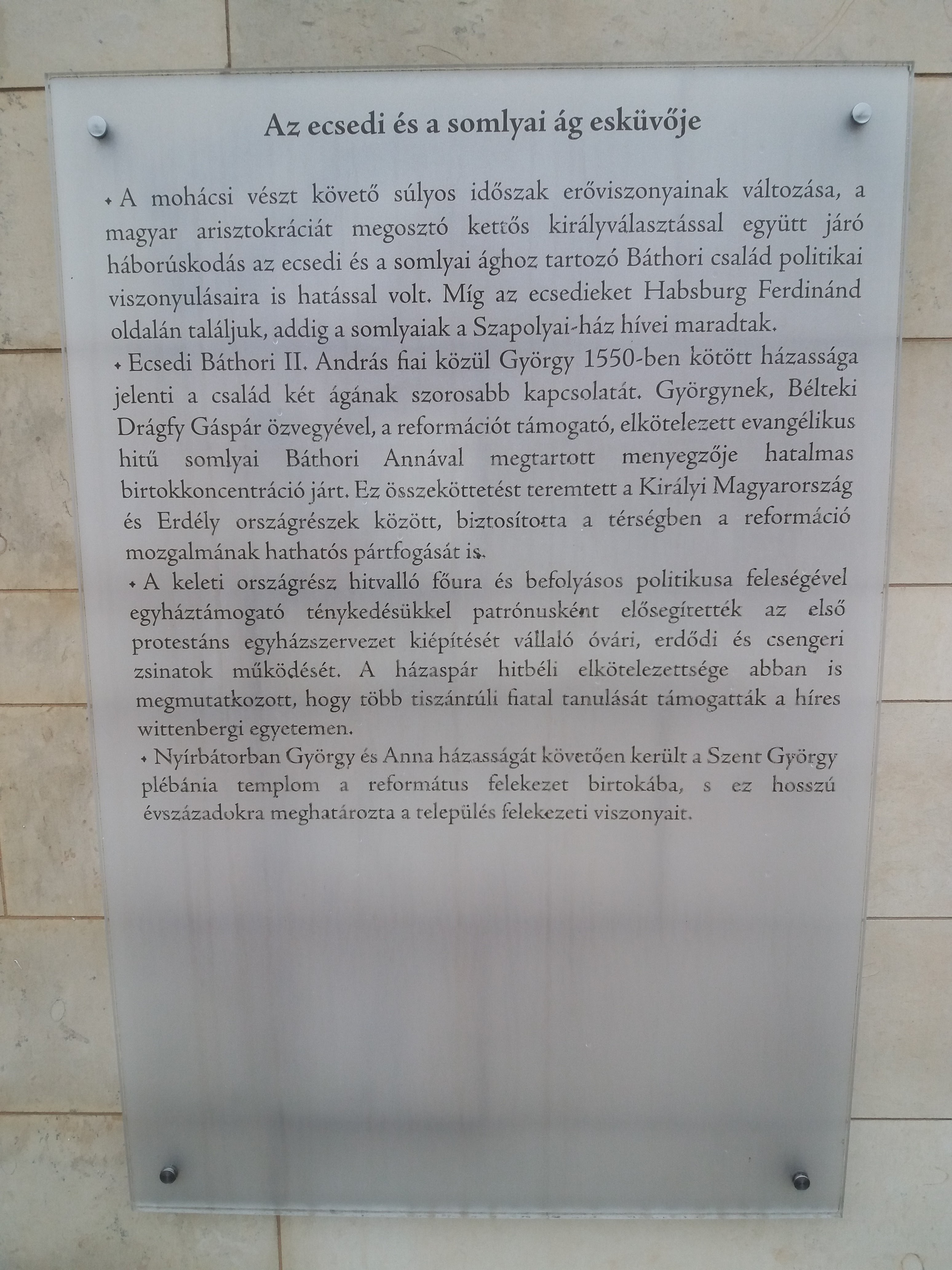 Ezután a református templomba sétáltunk át, egy nagyon klassz várostörténeti sétányon keresztül, ahol különböző jeleneteket láttunk a Báthoriak életéből. Számos érdekes történetet megtudtunk a Báthori-család életéről, láttuk a család két ágának (az ecsedi és a somlyói ágnak) egyesülését jelentő 1550-es esküvőt, (érdekes, hogy ebből a házasságból született a hírhedt, bár állítólag teljesen ártatlanul megvádolt Báthory Erzsébet), végignéztük a Báthoriak ősének, Vidnek a harcát az ecsedi lápban élő sárkánnyal (miután legyőzte, elhozta három fogát, ezért szerepel a Báthoriak címerében a  három sárkányfog), de a leghátborzongatóbb a Szentvér legenda ábrázolása volt. Állítólag Báthori Gábor fiatal lányát elrabolták a vörös barátok, ő pedig bosszúból lemészárolta a papokat, akiknek a vére végigfolyt azon az utcán, amelynek neve az 1600-as évek óta Szentvér út. És hogy mi köze a Báthoriaknak a sárkányhoz?  A legenda persze nagyon szép (Vid és a sárkány harca), de a valóságban az idegen eredetű családnak szüksége volt egy eredetmítoszra, és mivel a sárkányölő Szent Györgyöt választották patrónusuknak, adott volt a hozzá tartozó legenda is. A sétány egy pontján egy érdekes miniszobrot pillantottunk meg, Kolodko Mihály ukrán szobrászművész alkotása, a címe: A sóhordó. A művész több miniszobrot is elhelyezett Budapesten, de ma már több vidéki városban is láthatók alkotásai, pl. itt Nyírbátorban. Ezt a szobrot az egykor Nyírbátoron áthaladó sóút inspirálta. (